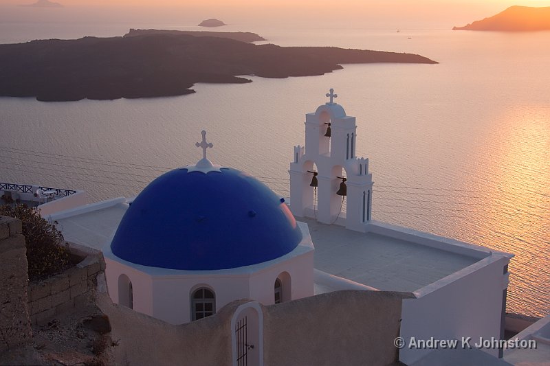 | Church domes against the caldera sunset at Firostephani, Santorini. This is the one on all the guide books. We tried for ages to find it - in the end I worked out its position to about 100m by working out on the map where you woulld get this angle between the two islands in the caldera. | |