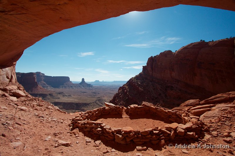 | This beautiful spot in Canyonlands National Park is known as "False Kiva". The NPS have a rather ambivalent attitude to it - it's not on any maps, but whn you get there there's an ammo tin with a visitors' book in it! | |