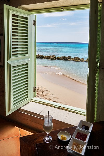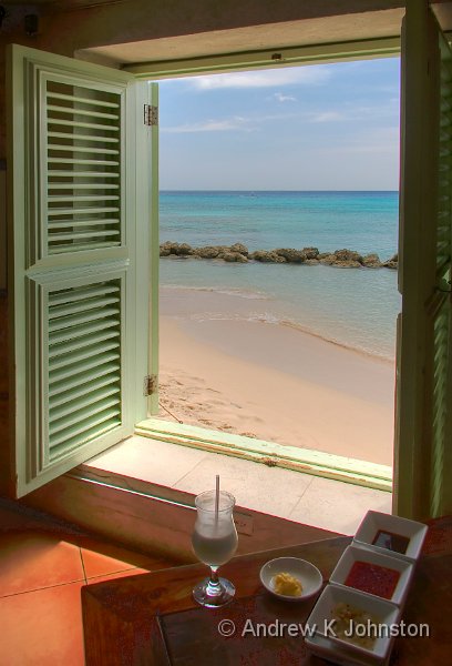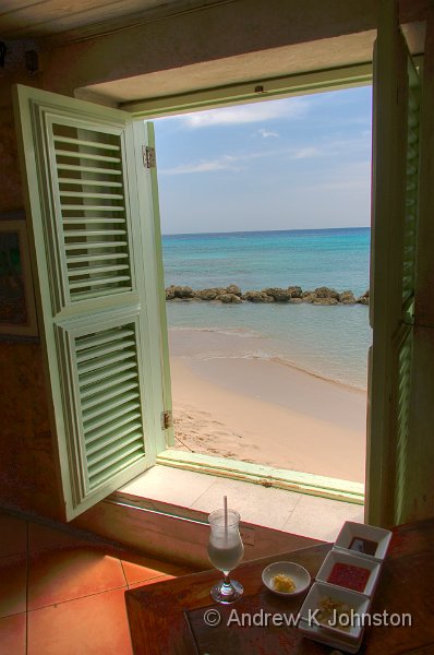 My photography mentor, Bob Kiss, recently posted an image of his, taken in Tuscany, of a Tuscan field scene shot through a window, with the light carefully balanced so that you can clearly see both the exterior, and the interior around the window. It immediately reminded me of a not dissimilar shot I took many years ago, at the Fish Pot in Barbados.